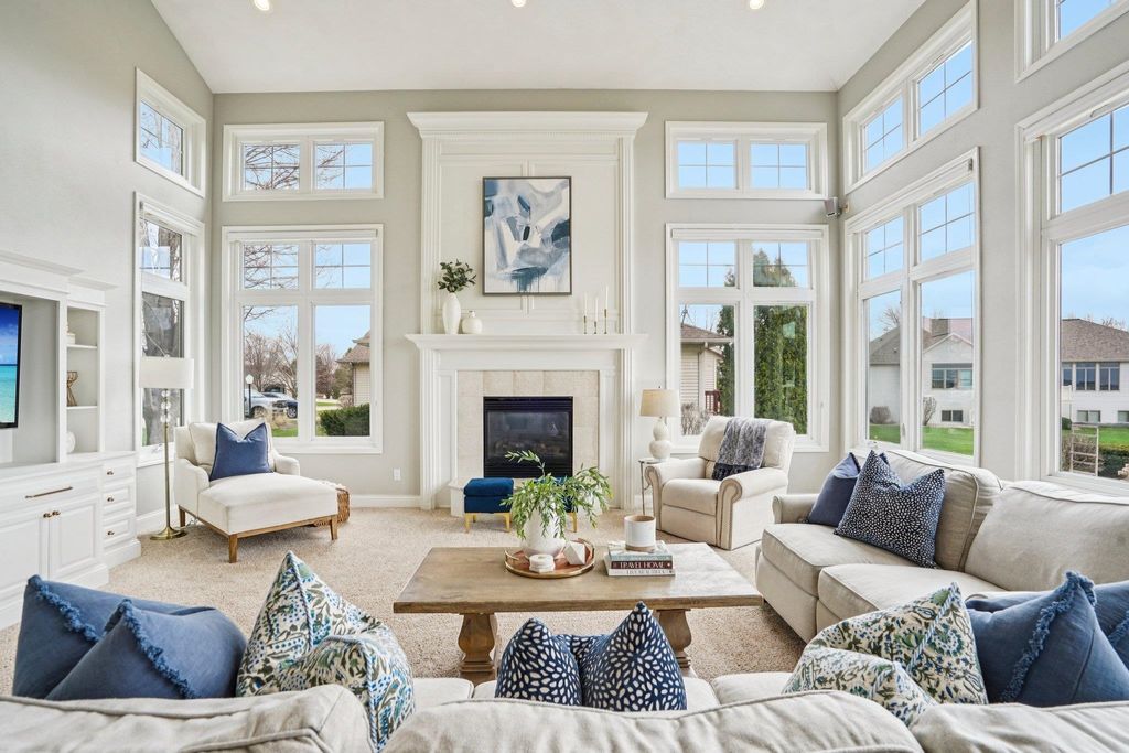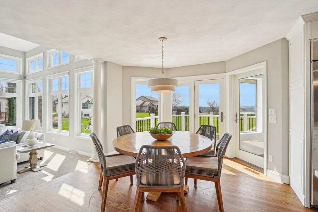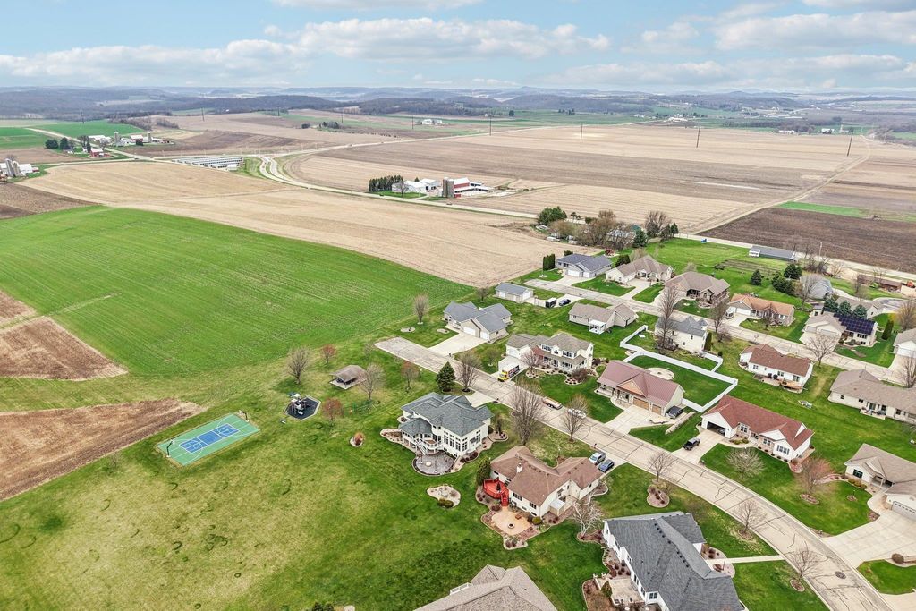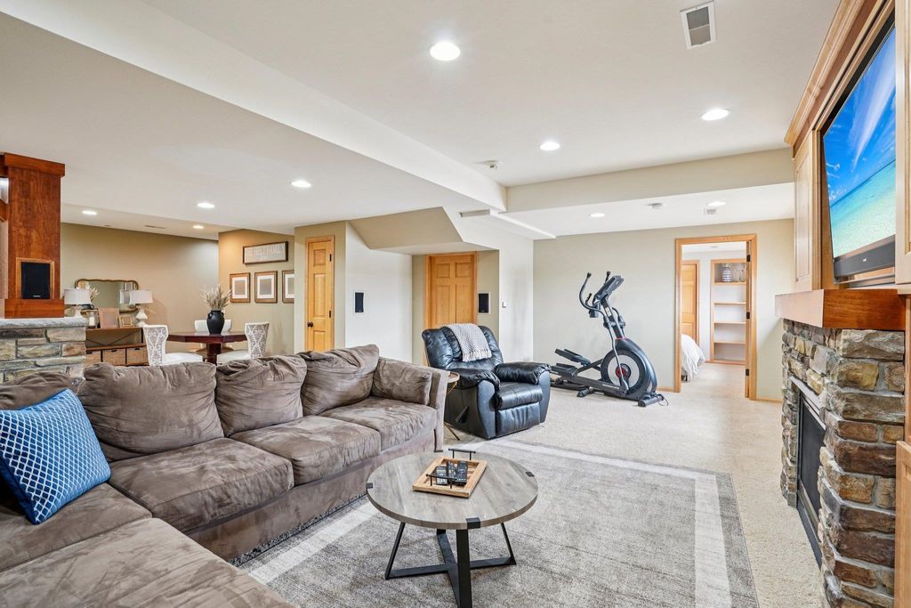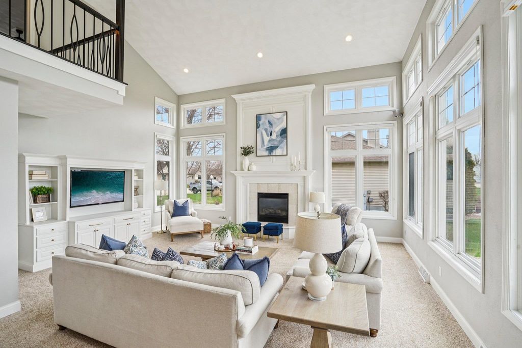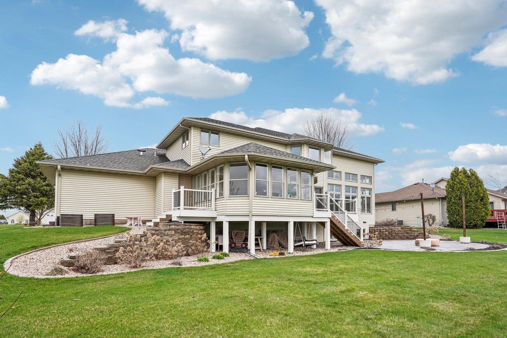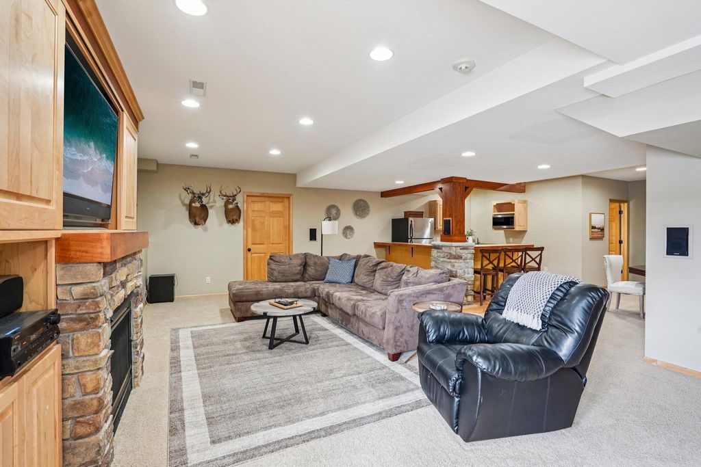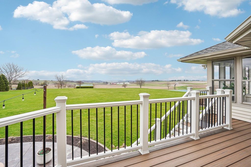 Showings start 4/24. Stunning 2-story next to quiet neighborhood park with breathtaking southern views of rolling hills! Vaulted great room with floor-to-ceiling custom fireplace, refinished hardwood floors & freshly painted throughout. Gorgeous sunroom. Completely updated designer kitchen shines with white cabinetry, quartz countertops, stainless appliances, large island/breakfast bar & chef's pantry. Main floor office with custom built-in desk/office cabinetry. Main floor laundry. Updated bathrooms. Upstairs has 3 spacious bedrooms & primary suite with walk-in closet, jetted tub, glass block double shower & in-floor heating/cooling. Exposed lower level has a 4th bedroom, full bath, family room w/custom fireplace, built-in entertainment center & kitchenette. Newer HVAC & water heater, zoned heating/cooling. 3+ car garage w/basement access & epoxy floors. Enjoy outdoor living with new Trex deck, stamped concrete patio, gas fire pit, and fresh landscaping. A must-see!