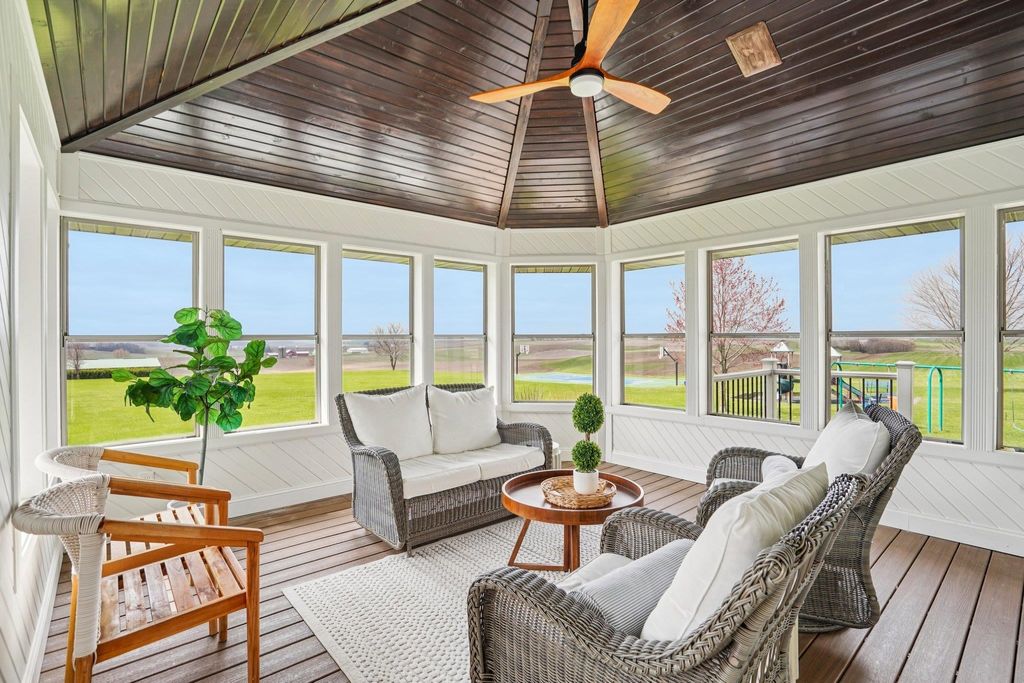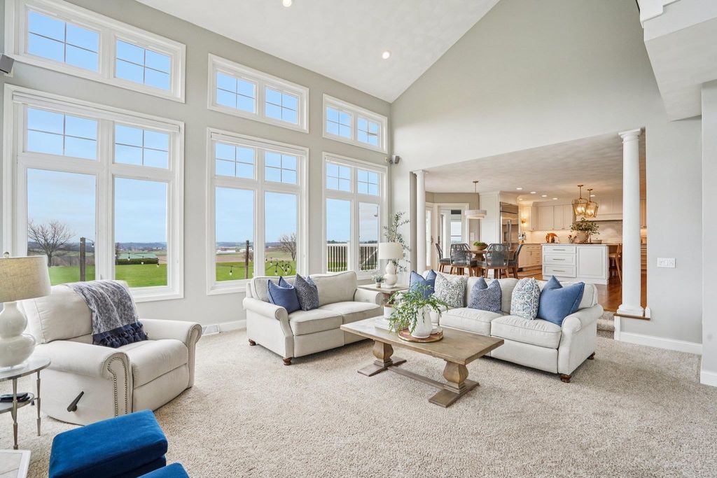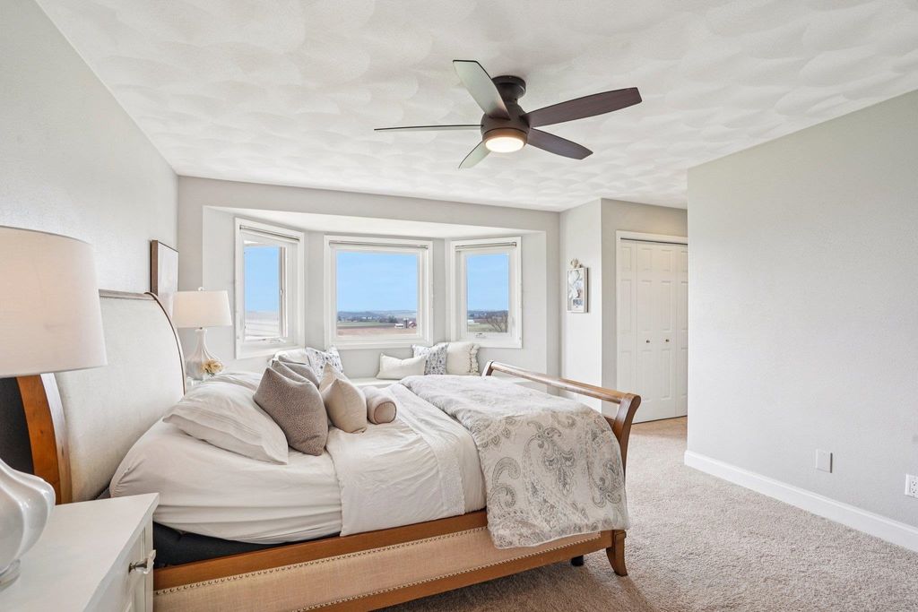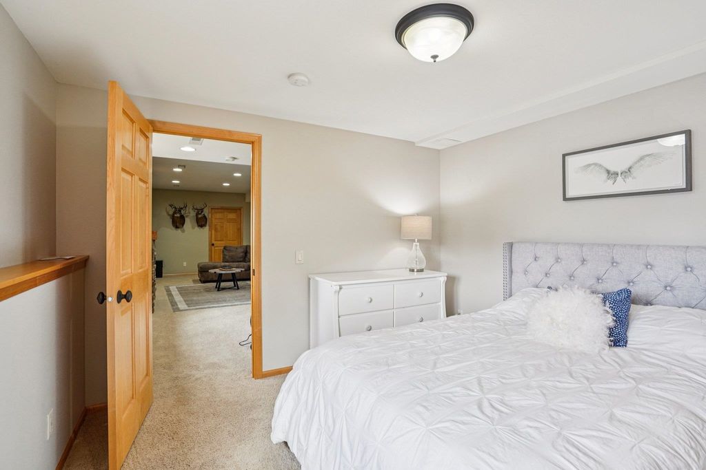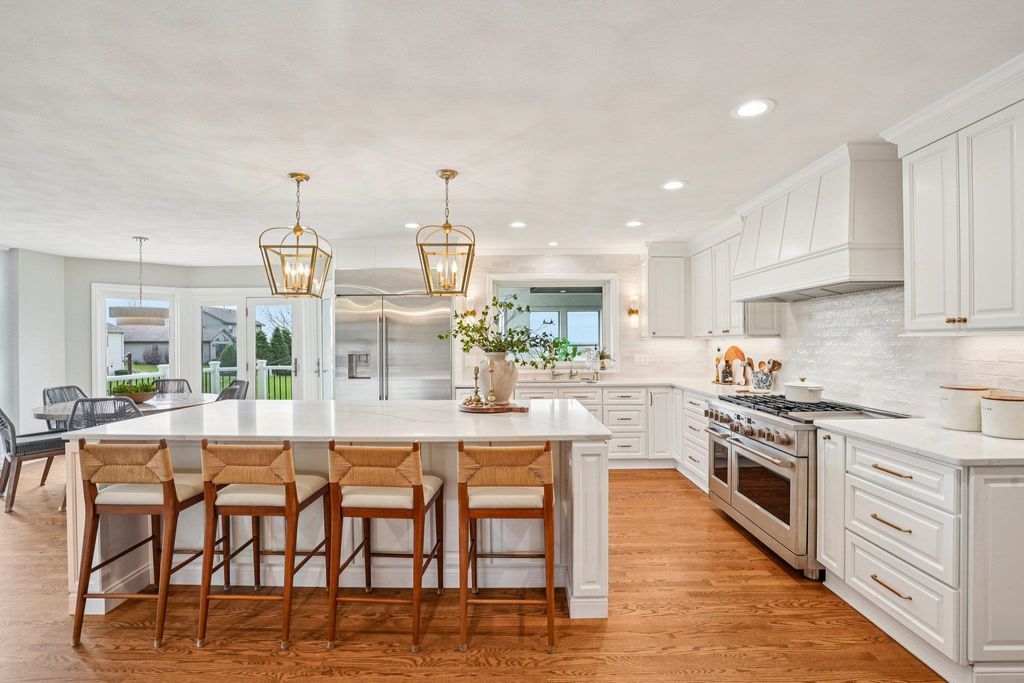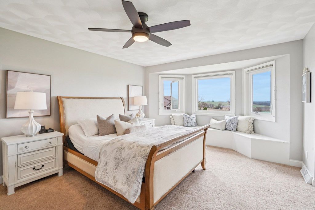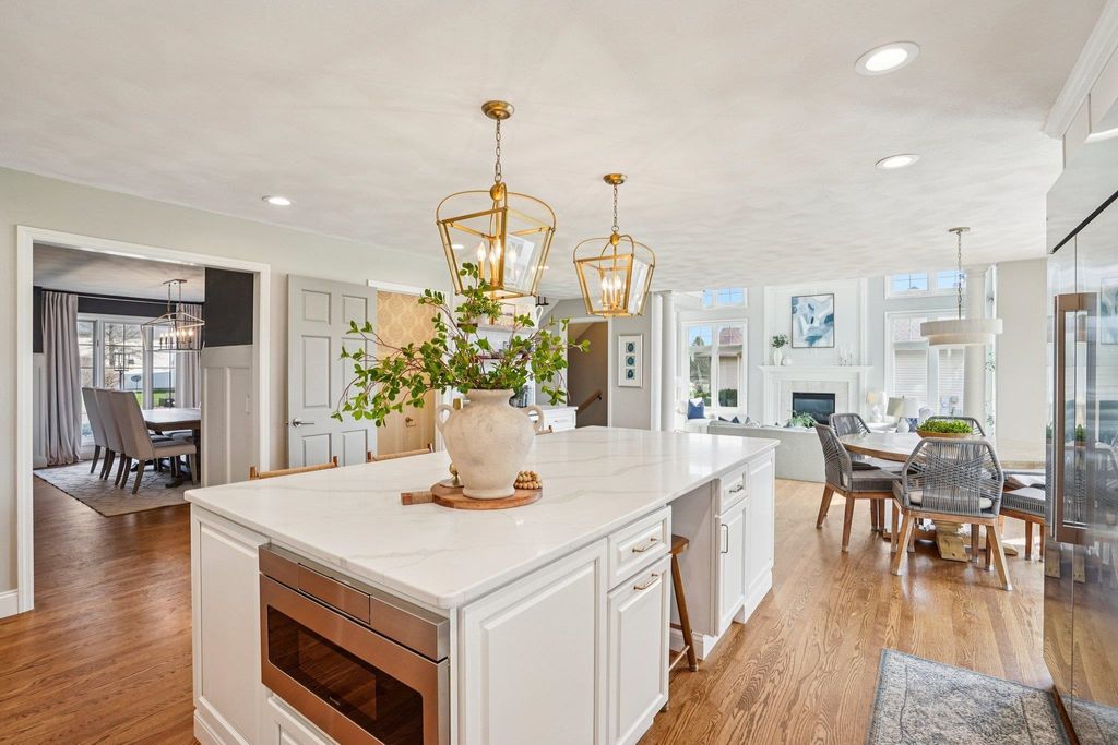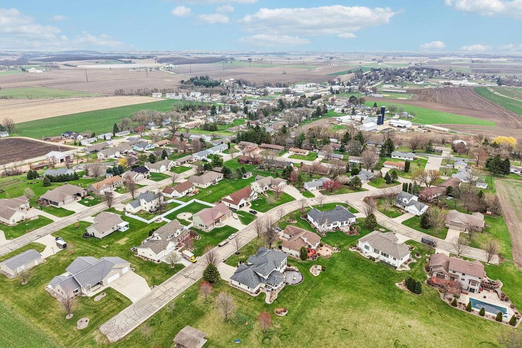 Showings start 4/24. Stunning 2-story next to quiet neighborhood park with breathtaking southern views of rolling hills! Vaulted great room with floor-to-ceiling custom fireplace, refinished hardwood floors & freshly painted throughout. Gorgeous sunroom. Completely updated designer kitchen shines with white cabinetry, quartz countertops, stainless appliances, large island/breakfast bar & chef's pantry. Main floor office with custom built-in desk/office cabinetry. Main floor laundry. Updated bathrooms. Upstairs has 3 spacious bedrooms & primary suite with walk-in closet, jetted tub, glass block double shower & in-floor heating/cooling. Exposed lower level has a 4th bedroom, full bath, family room w/custom fireplace, built-in entertainment center & kitchenette. Newer HVAC & water heater, zoned heating/cooling. 3+ car garage w/basement access & epoxy floors. Enjoy outdoor living with new Trex deck, stamped concrete patio, gas fire pit, and fresh landscaping. A must-see!