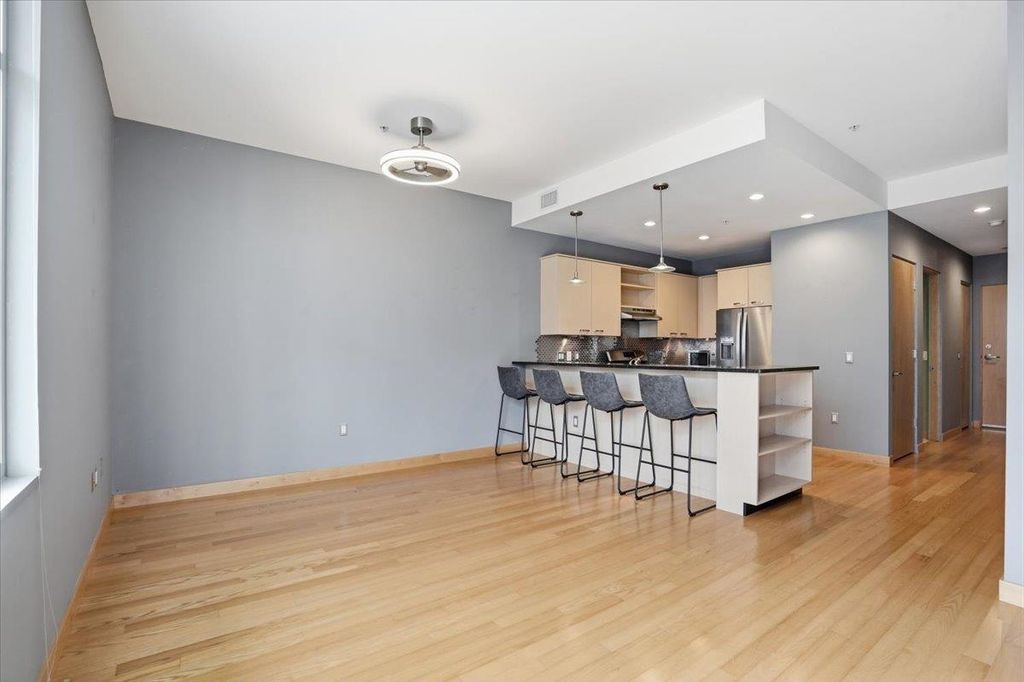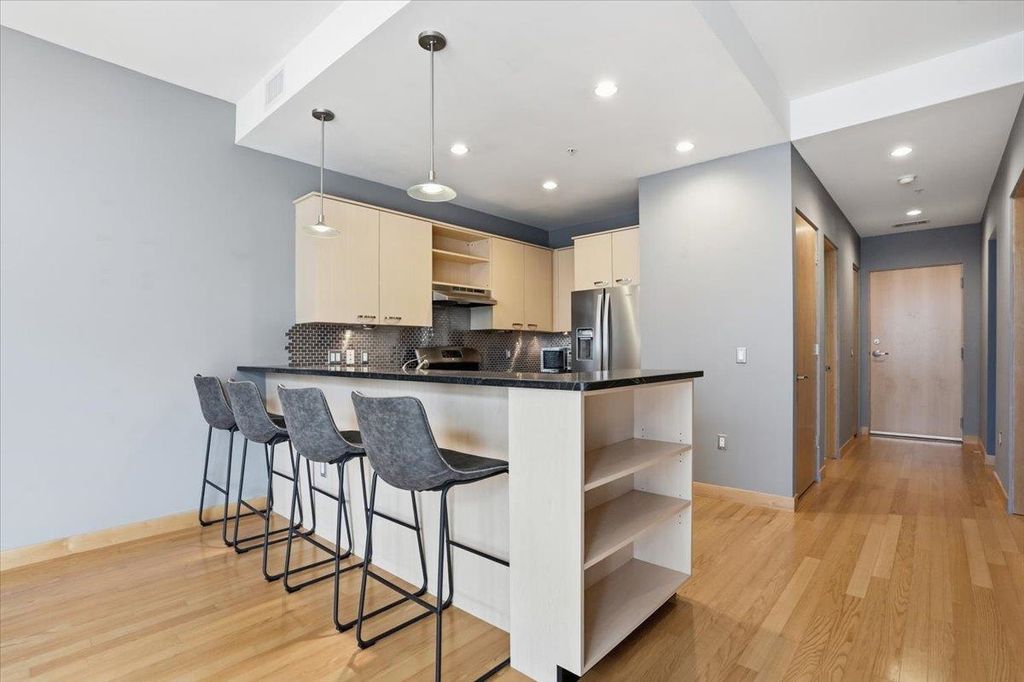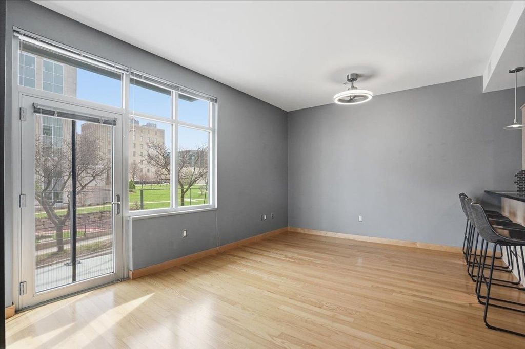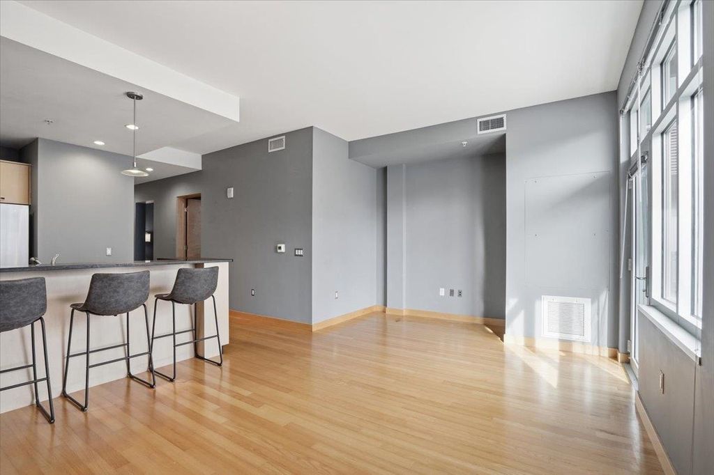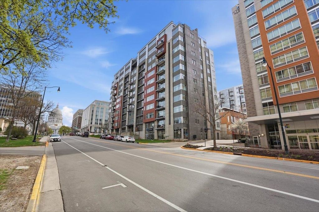 Take a look at this stunning downtown condo filled with beautiful natural light and elegant maple floors. The spacious open layout extends to a private balcony, creating a perfect space to relax or entertain. The kitchen features ample storage and generous stone counter space, along with a large bar ideal for hosting guests. Enjoy the added convenience of in-unit laundry, plus a versatile den or office that can easily serve as a guest room. The building offers attentive onsite management, underground parking, and a fitness room. All of this is within walking distance of the Capitol, the Farmers Market, State Street, local restaurants, Badger games, and more. Don't miss your chance to own this spacious downtown oasis!