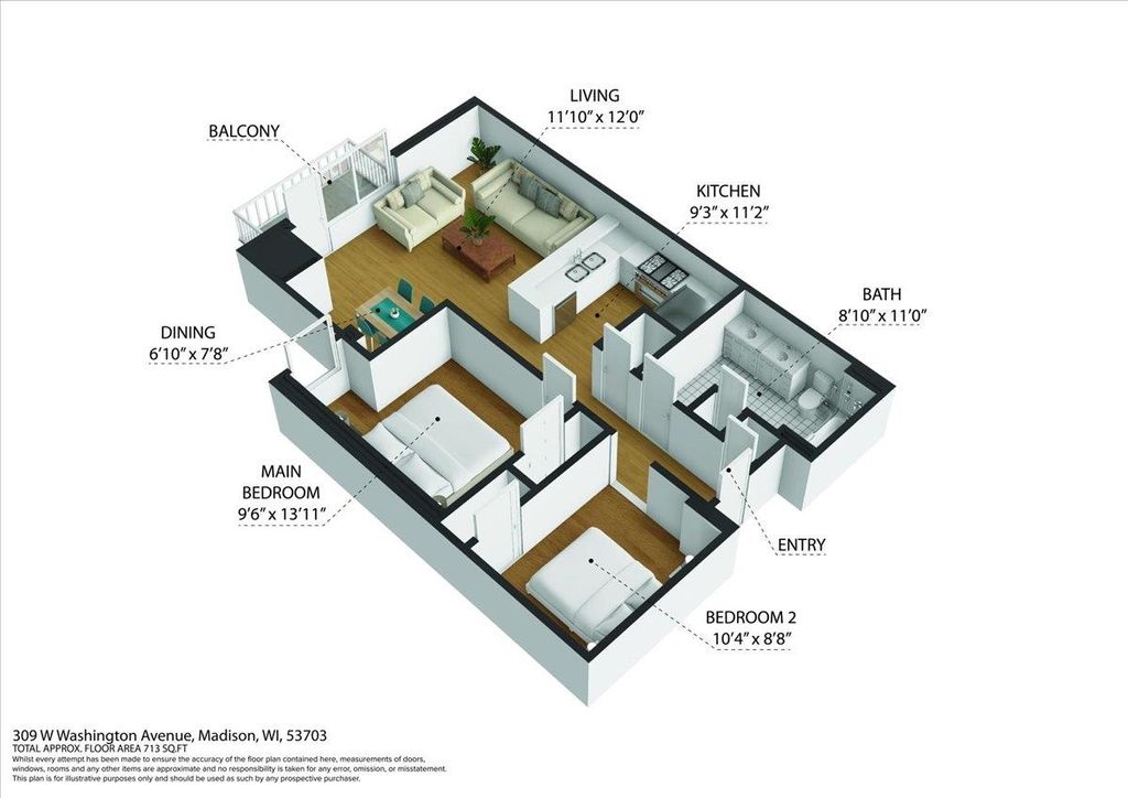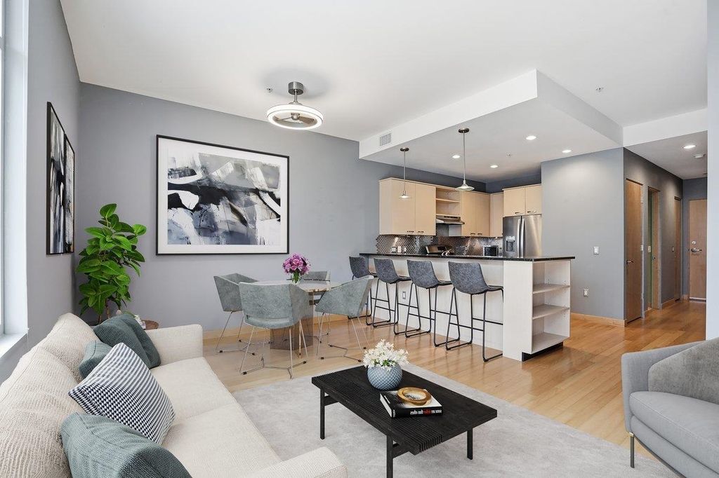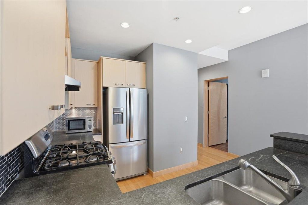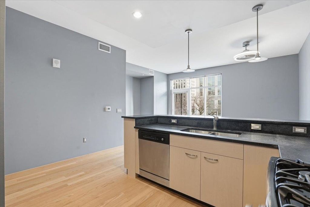 Take a look at this stunning downtown condo filled with beautiful natural light and elegant maple floors. The spacious open layout extends to a private balcony, creating a perfect space to relax or entertain. The kitchen features ample storage and generous stone counter space, along with a large bar ideal for hosting guests. Enjoy the added convenience of in-unit laundry, plus a versatile den or office that can easily serve as a guest room. The building offers attentive onsite management, underground parking, and a fitness room. All of this is within walking distance of the Capitol, the Farmers Market, State Street, local restaurants, Badger games, and more. Don't miss your chance to own this spacious downtown oasis!