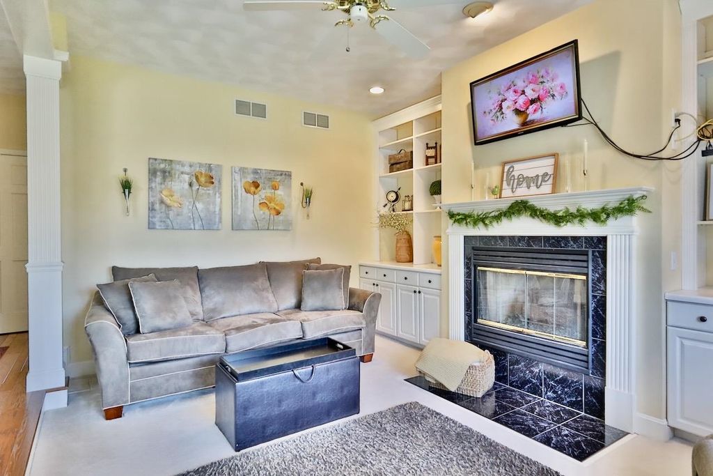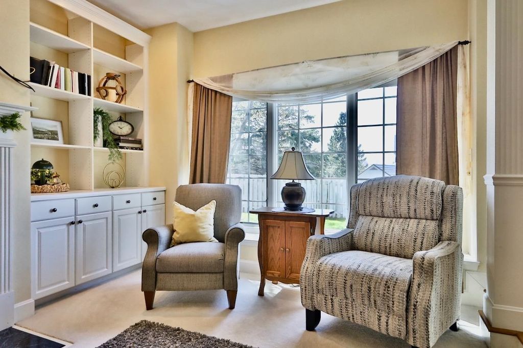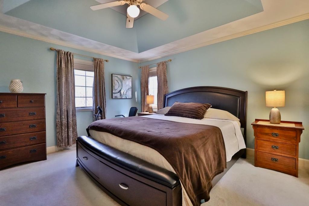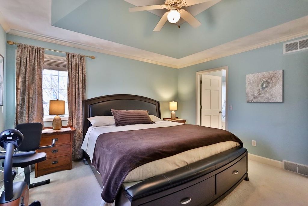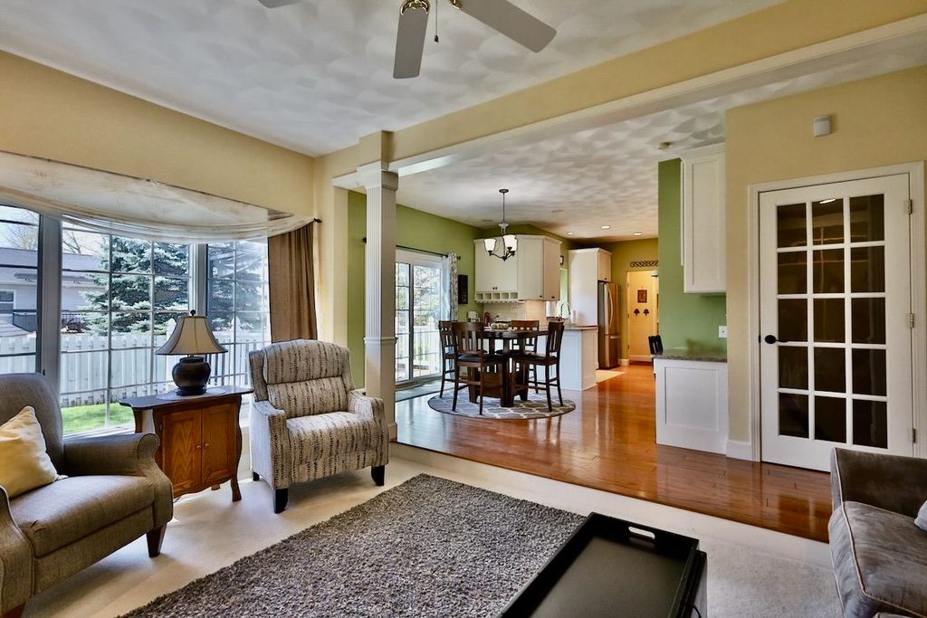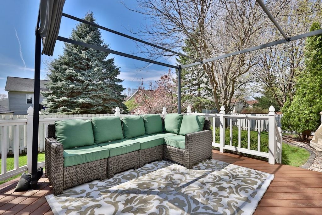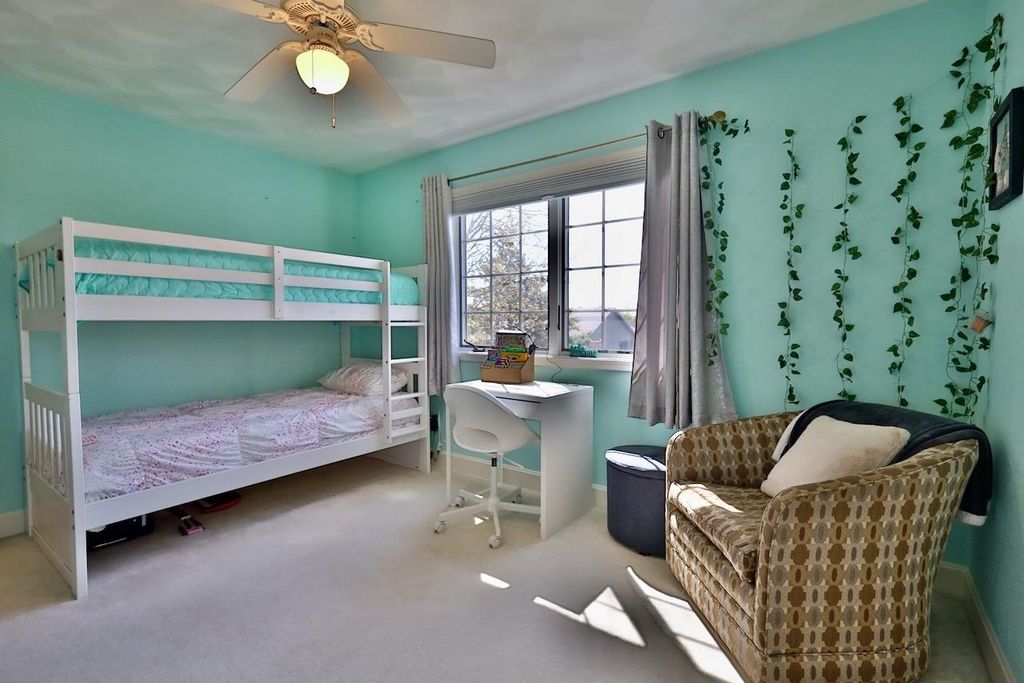 This rare Parade Home on a quiet cul-de-sac is move-in ready! This custom-built home offers 3 bedrooms, 3.5 baths, and a finished lower level. Enjoy a light-filled entry with a circular staircase and an open family room with a remodeled kitchen (2017). Features include hardwood floors, crown molding, 9-ft ceilings, built-in desk, and fireplace. The primary suite has a Jacuzzi tub and skylight; bedrooms 2 and 3 share a Jack-and-Jill bath. Lower level includes a family room, office, built-ins, and full bath. Relax in a private fenced in backyard with firepit. 2.5+ car garage. Updates: roof (2015), A/C (2021).