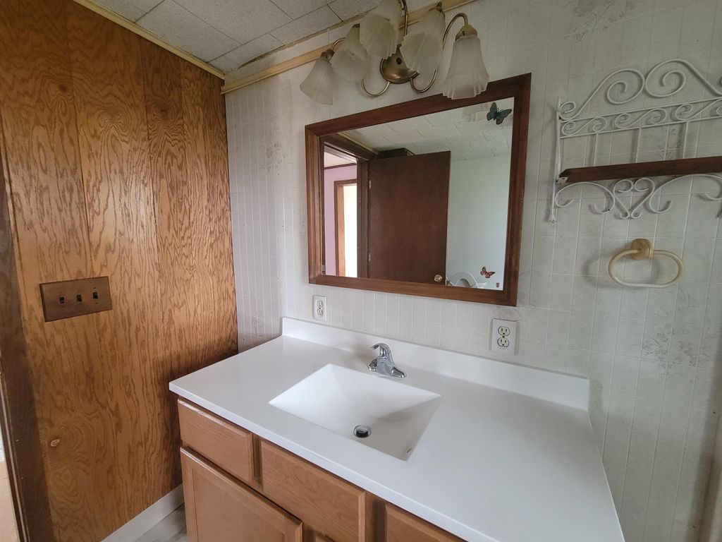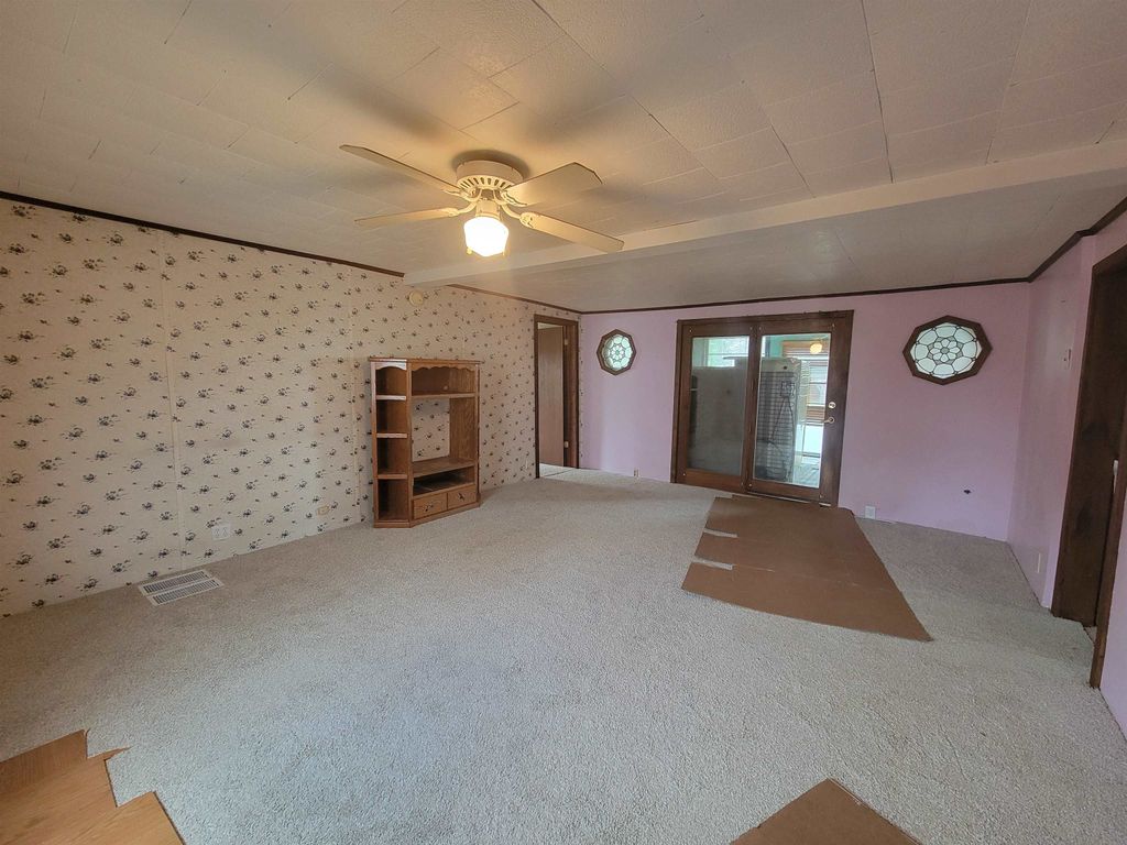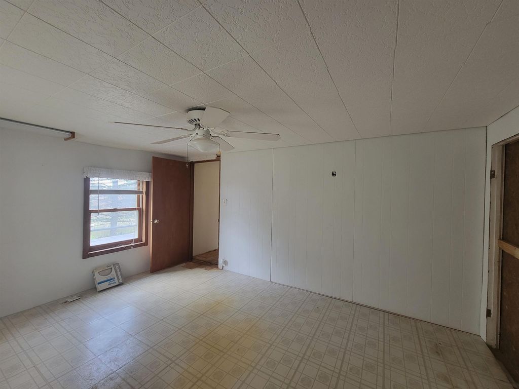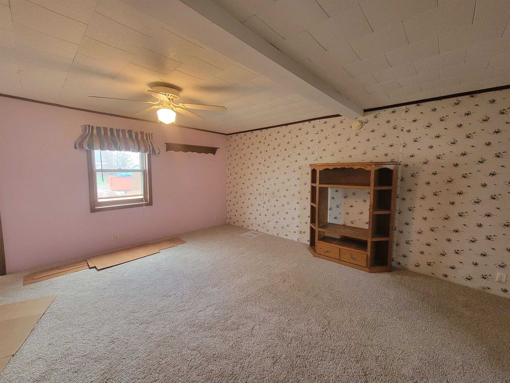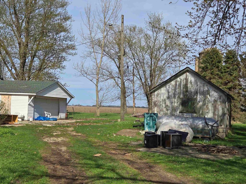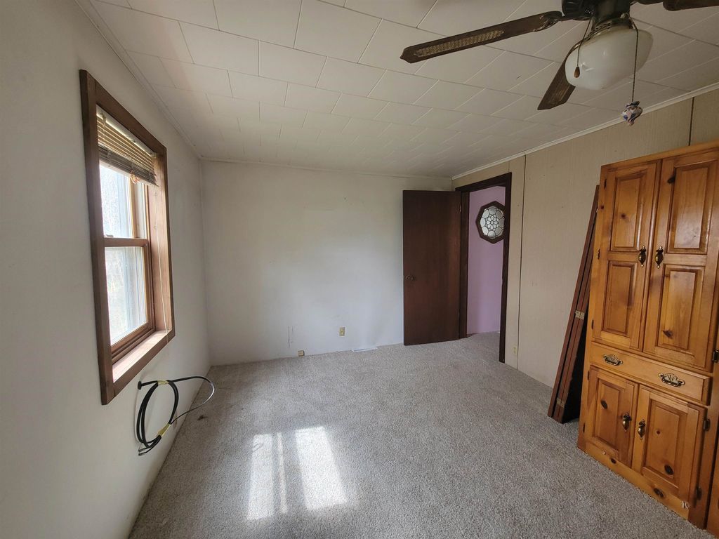 Spacious older farmhouse with lots of potential. Huge "Country Kitchen" has been recently updated with brand new lower cabinets, counters and flooring. Newer carpeting in living room and main floor bedroom. Upstairs carpet will need to be replaced. Private, peaceful 2 acre setting with mature trees. Nice sized two car garage. Due to recent storms, the main roof has had some shingles lifted and owner is in process of repairing. Could be a lovely property once again with some TLC.