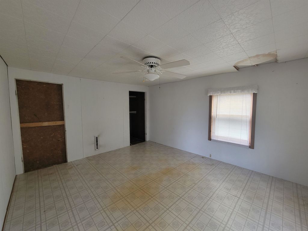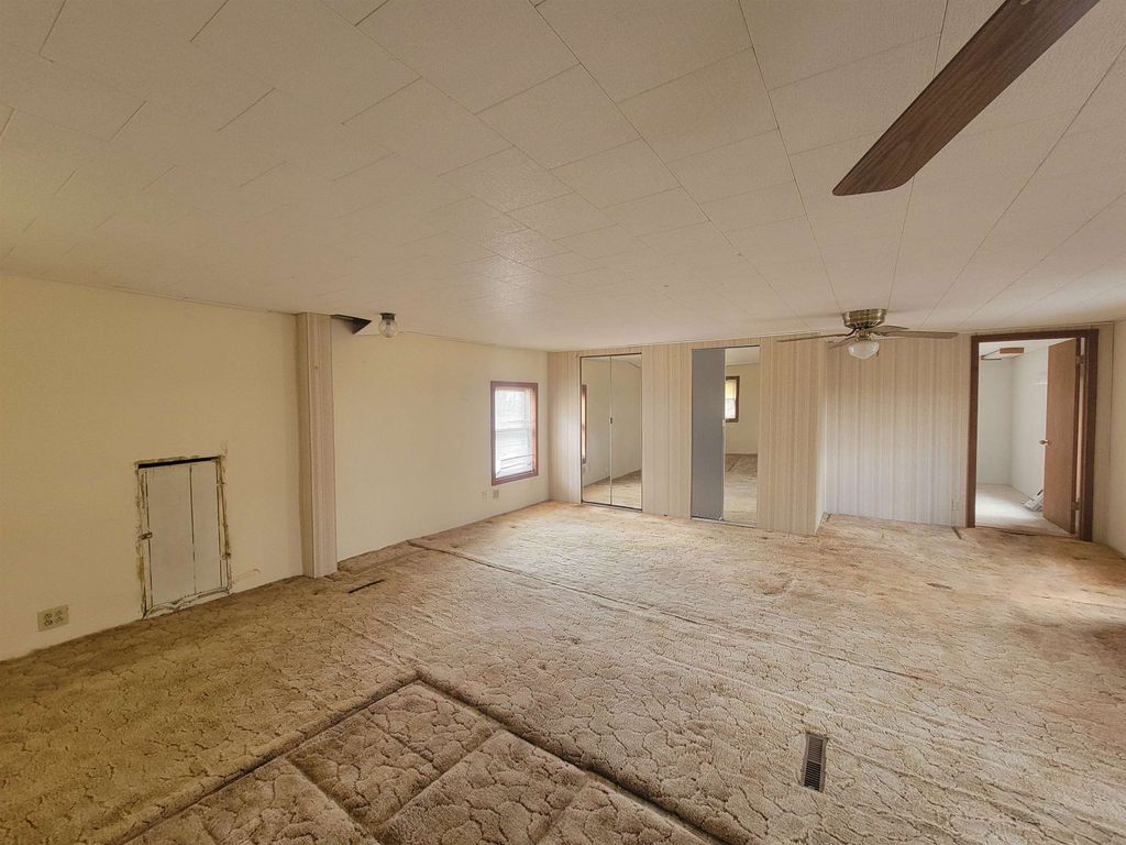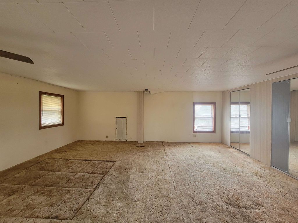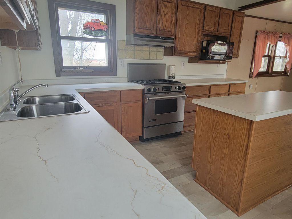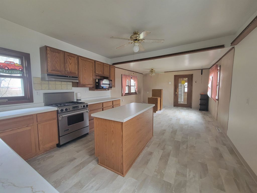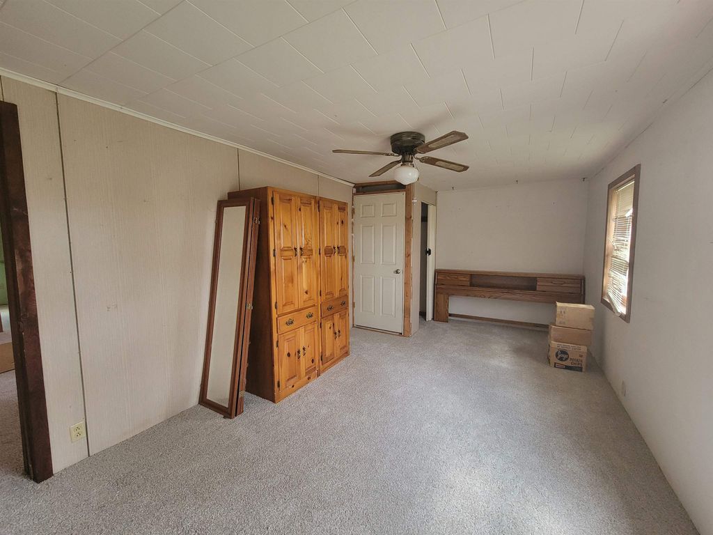Spacious older farmhouse with lots of potential. Huge "Country Kitchen" has been recently updated with brand new lower cabinets, counters and flooring. Newer carpeting in living room and main floor bedroom. Upstairs carpet will need to be replaced. Private, peaceful 2 acre setting with mature trees. Nice sized two car garage. Due to recent storms, the main roof has had some shingles lifted and owner is in process of repairing. Could be a lovely property once again with some TLC.