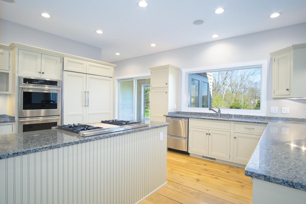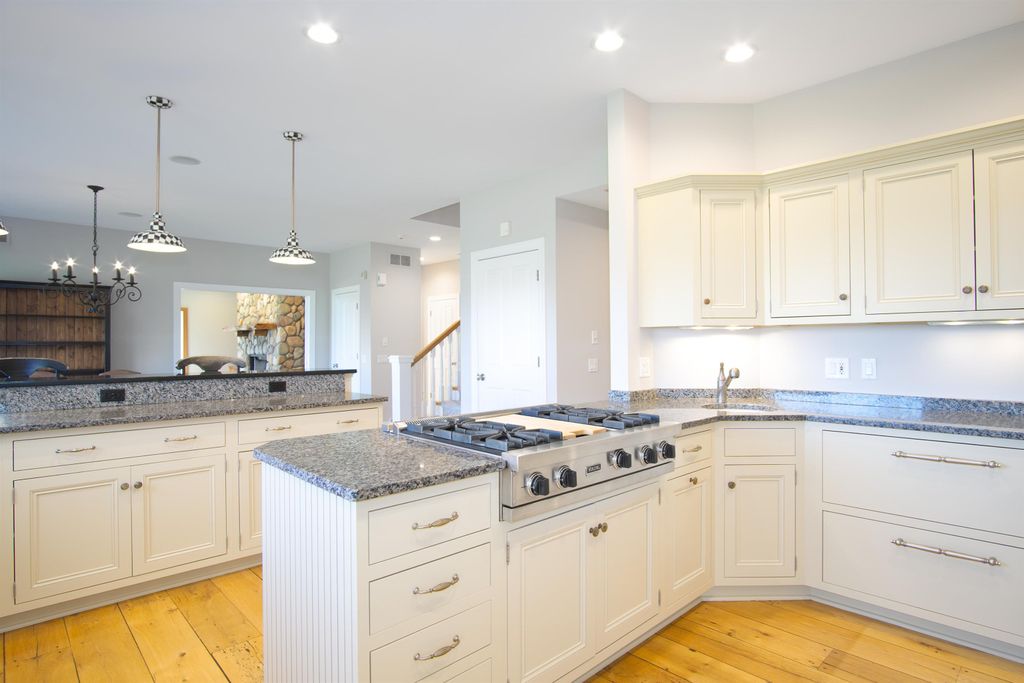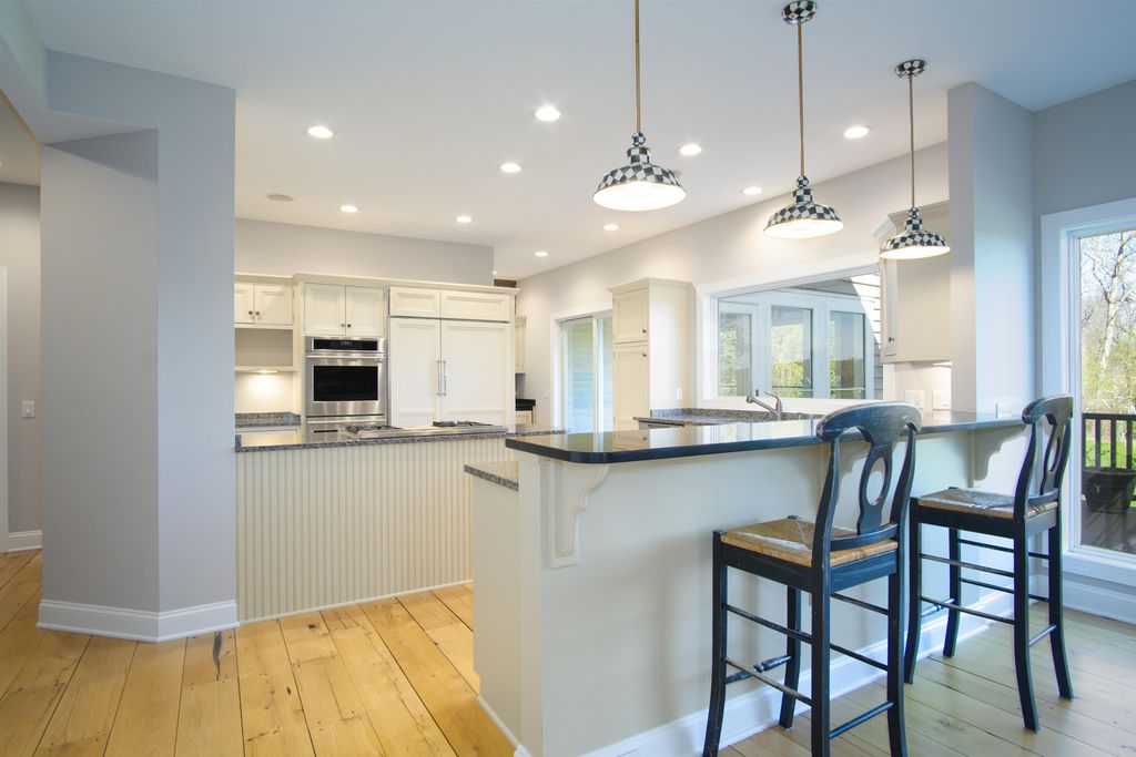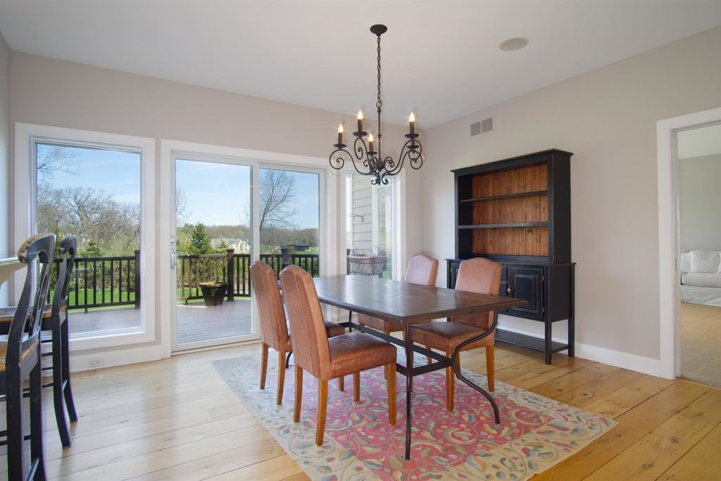 This elegant 5 bedroom home exudes warmth from the moment you pull into the driveway. The covered front porch welcomes you through the front door where you're greeted by warm reclaimed hickory floors and a stunning open staircase. The kitchen is a chef's delight featuring high end appliances and ample work space and storage. The great room